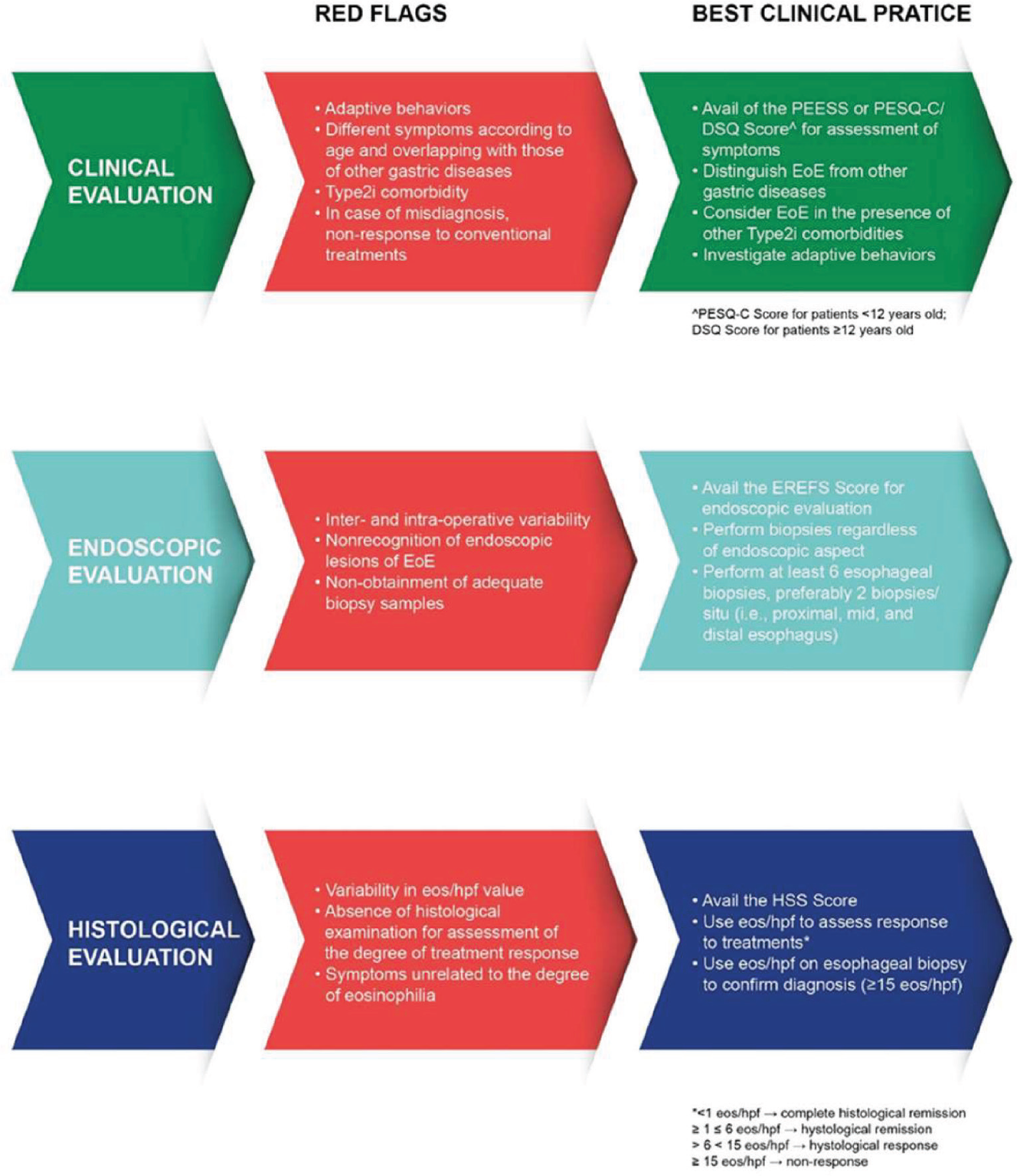 FIGURE 2 -. Key red flags and best practices in clinical, endoscopic, and histologic assessment. Acronyms: DSQ: Dysphagia Symptom Questionnaire; EoE: Eosinophilic Esophagitis; eos/hpf: Eosinophils per High-Power Field; EREFS: Endoscopic Reference Score; HSS: Histology Scoring System; PEESS: Pediatric Eosinophilic Esophagitis Symptom Severity; PESQ-C: Pediatric Eosinophilic Esophagitis Sign/Symptom Questionnaire – Caregiver; Type 2i: Type 2 Immune-mediated inflammatory disease.