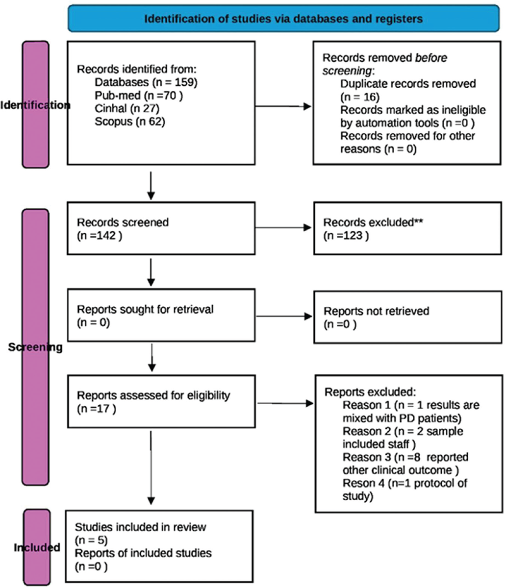 The initial screening process identified 159 studies, of which 16 were duplicates. Figure 1 illustrates the search collection and screening process using Preferred Reporting Items for Systematic Reviews and Meta‐analyses (PRISMA) extension for the scoping reviews checklist (15). After screening of titles, abstracts, and introductions, 17 were selected for full‐text review, with only 5 meeting all the inclusion criteria. Two authors independently reviewed and assessed the studies for eligibility, and consensus was reached in all four studies.