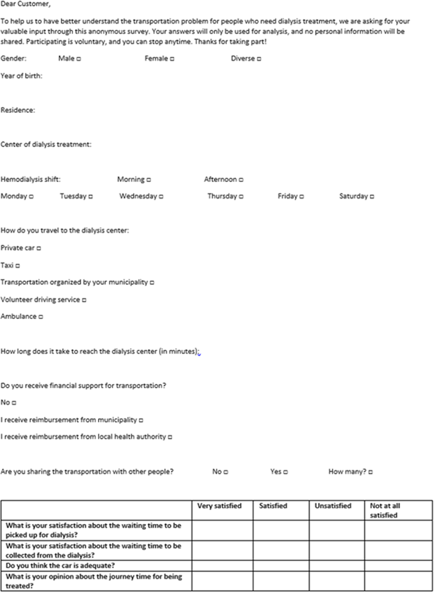 The organization of transportation for in-center hemodialysis (HD) is a complex challenge and can be considered one of the Social Determinants of Health (SDoH). Long travel times to dialysis centers have been associated with increased mortality risk and poorer health-related quality of life (1). SDoH remain a problem for the general population (2). In many countries, the health effects associated with transportation difficulties in dialysis patients have been largely overlooked and are often underestimated by healthcare professionals. Despite being a key factor in access to HD, even though suboptimal arrangements are frequently reported as sources of stress and anxiety. Transportation arrangements depend on family involvement, health status, social support, and household income, and may vary widely across different healthcare systems organizations around the world. The Italian National Health Service is a universalistic system that guarantees coverage for all citizens with health needs. A validated questionnaire developed to investigate logistic issues in HD patients is missing. This study aimed to identify and better understand the transportation options available to in-center HD patients and to describe their experiences from the perspective of Italian citizens by using a pilot-tested questionnaire.