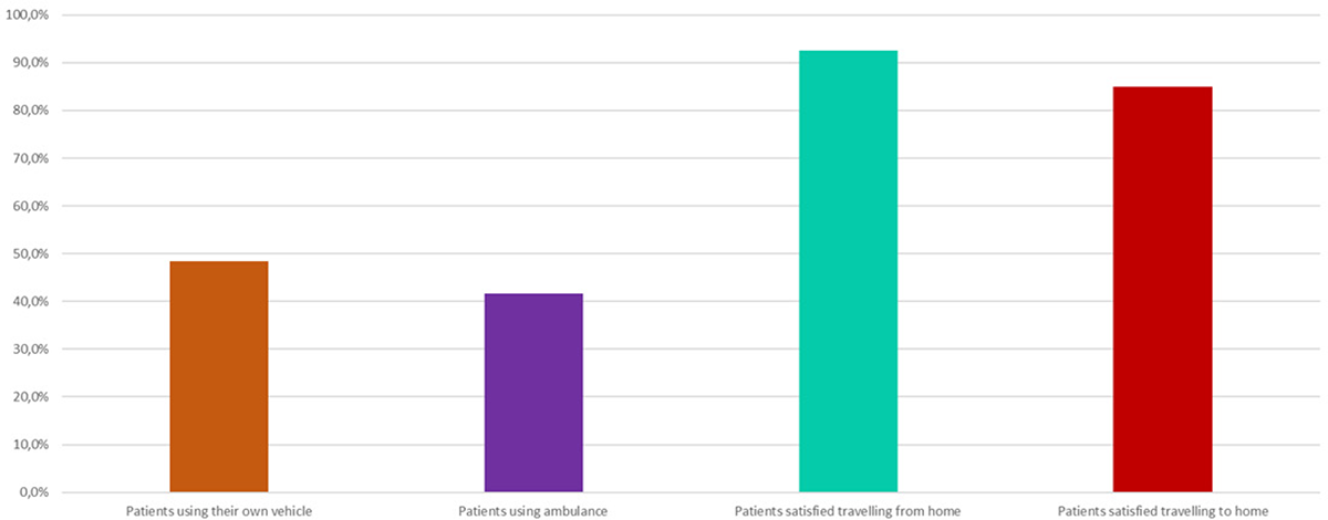 FIGURE 2 -. Percentage of patients using their own vehicle, using an ambulance, satisfied with traveling from home and to home to the dialysis clinic, considering the whole population.