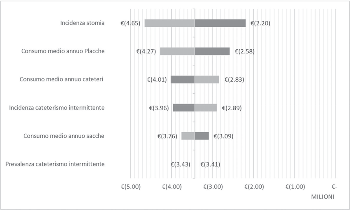 L’analisi di sensibilità deterministica ha ulteriormente confermato la robustezza e la validità dei risultati ottenuti, indicando una sostanziale stabilità delle conclusioni al variare dei principali parametri economici ed epidemiologici considerati. Tuttavia, l’incidenza della stomia e i consumi medi annui di placche e cateteri sono risultati i parametri con maggiore impatto economico, suggerendo l’opportunità di ulteriori approfondimenti e aggiornamenti epidemiologici per ridurre l’incertezza associata al modello.