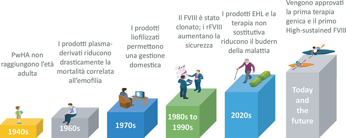 Oggi, la life expectancy dei soggetti con emofilia A è equiparabile a quella della popolazione generale e per questo è più corretto parlare di persone con emofilia A (people with HA, PwHA) piuttosto che di pazienti. In realtà, però, la comparazione è in termini di anni di vita guadagnati e non di anni di vita liberi da malattia; quindi, si vive più a lungo ma in presenza di dolore cronico e di disabilità.