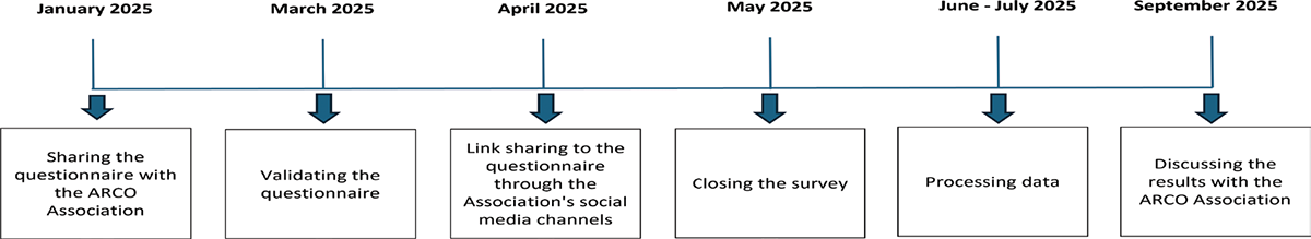 A cross-sectional, self-administered, internet-based survey was developed following the methodological steps summarized in Figure 1. In particular, the questionnaire was first shared with the ARCO Association to adapt it to the context of the analysis. The final version of the questionnaire, validated by the patient association, was published online on the association’s social media channels (Facebook and Instagram) from April 11 to May 12, 2025. The questionnaire was completed by the patients themselves or by their caregivers; patients and caregivers were asked to provide information about each other where available. The data was collected in a completely anonymous form. June and July were spent processing data, while in September, the results were discussed with the Patient Association.