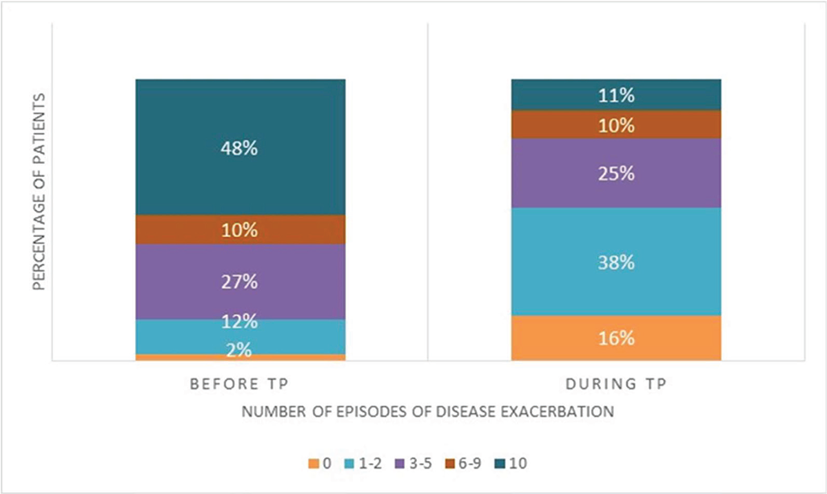 FIGURE 2 -. Distribution of patients for each class of number of episodes of disease exacerbation before and after the start of the therapeutic plan. TP: Therapeutic Plan; Estimates calculated on 73% and 66% responding patients, respectively, for the question about the number of episodes before and after the treatment plan.