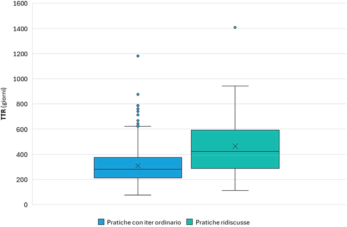 FIGURA 1 -. Distribuzione del TTR nei sotto-campioni di pratiche con iter ordinario e ridiscusse. Il TTR è definito come il tempo intercorso, per ciascuna pratica, tra la data di prima discussione da parte della CTS e la pubblicazione della determina di prezzo e rimborso in GU. Nel grafico, il rettangolo (box) racchiude il 50% dei dati (dal primo quartile Q1 al terzo quartile Q3, le estremità dello stesso), la linea orizzontale e la “X” al suo interno rappresentano rispettivamente la mediana e la media, mentre le linee verticali (whiskers) si estendono fino ai valori minimi e massimi escludendo eventuali outliers, rappresentati dai singoli punti.