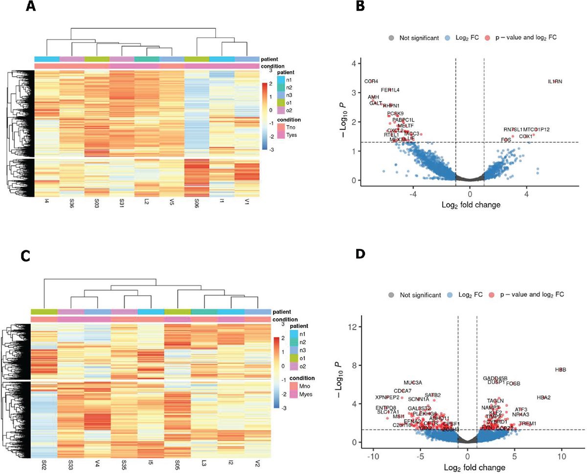 FIGURE 1 -. Comparative transcriptome of primary colon tumors and matched liver metastases in mCRC patients during neoadjuvant FOLFOXIRI. Cluster analysis of differentially expressed genes (DEGs) between the pre-treatment and post-treatment colon specimens. Up-regulated genes are represented in red, and down-regulated genes are represented in blue (A); Volcano plot for DEGs in primary colon tumors (B); Cluster analysis of DEGs between the pre-treatment and post-treatment liver lesions. Up-regulated genes are represented in red, and down-regulated genes are represented in blue (C); Volcano plot for DEGs in liver metastases (D).