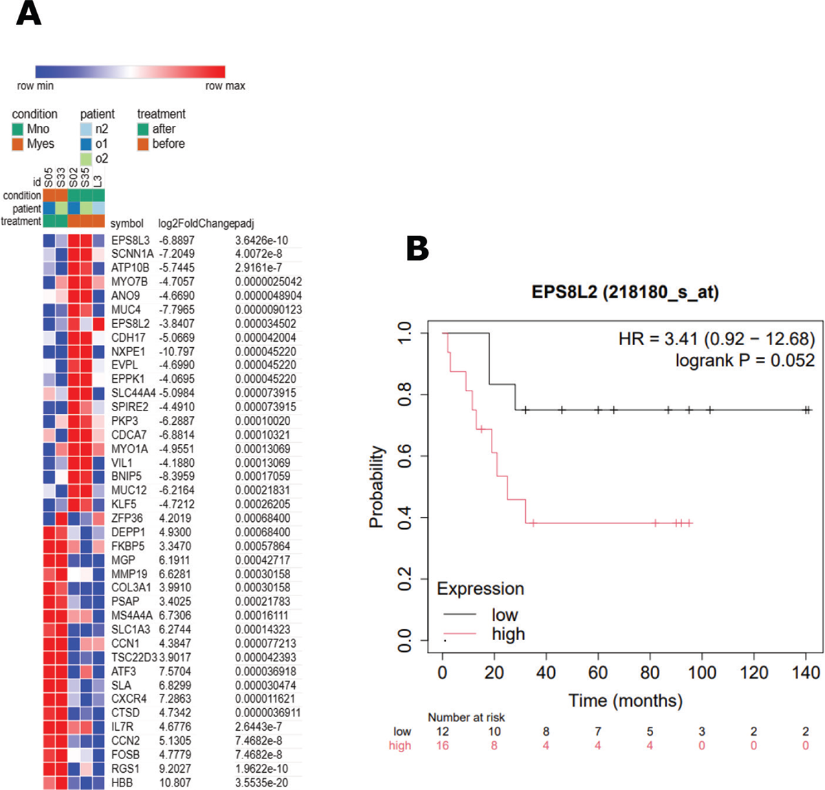 To identify genes predicting complete liver metastasis response after FOLFOXIRI, we performed additional transcriptome analysis in a patient who achieved a complete regression of liver metastatic lesions. Interestingly, EPS8L2 was the only highly expressed in this patient’s liver tissue before treatment compared to other patients (|Log2FC| = 3.84, FDR<0.05; Fig. 2A).