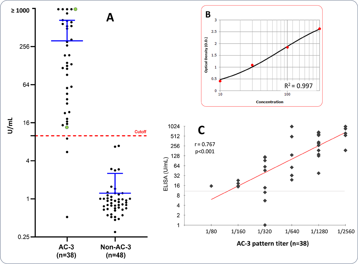 FIGURE 2 -. Reactivity to CENP-B in ELISA. (A) Anti-CENP-B reactivity tested by indirect ELISA. Distribution of anti-CENP-B reactivity in U/mL. The cutoff (red dotted line) was set at 10 U/mL as recommended by the manufacturer. The two data points in green indicate the two samples in which AC-3 was not initially reported, but it was observed in the HEp-2-IFA upon re-evaluation with serial dilution, as detailed in Figures 1B and C. The blue line indicates the mean ±SD. (B) A representative standard four-parameter logistic curve for the ELISA with anti-CENP-B standards. (C) Correlation between Anti-CENP-B reactivity by ELISA and the AC-3 pattern titer.