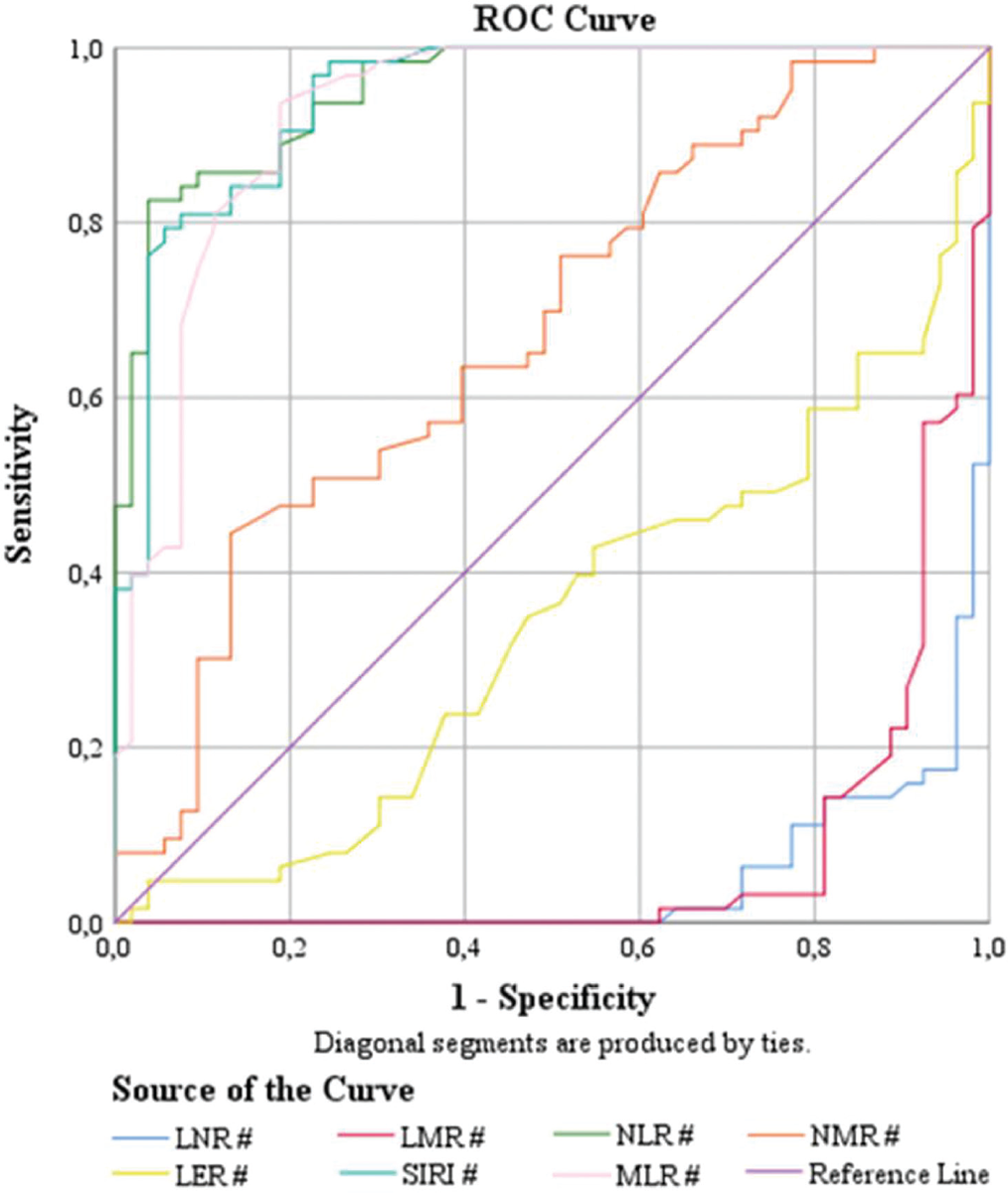 As a result of ROC analysis, threshold values were determined for the systemic inflammatory markers we investigated: For LNR, the area under the curve (AUC) = 0.951 ± 0.018; 95% confidence interval (CI): 0.917-0.986, p < 0.001; For SIRI, AUC = 0.943 ± 0.021, 95% CI: 0.903-0.984, p < 0.001; For MLR, AUC = 0.925 ± 0.026, 95% CI: 0.874-0.976, p < 0.001; For NMR, AUC = 0.675 ± 0.050, 95% CI: 0.577-0.773, p < 0.001; For LER, AUC = 0.339 ± 0.050, 95% CI: 0.241-0.437, p = 0.003; For LMR, AUC = 0.073 ± 0.026, 95% CI: 0.023-0.123, p < 0.001; For NLR, AUC = 0.049 ± 0.018, 95% CI: 0.014-0.083, p < 0.001 (Fig. 2, Table 5 ).