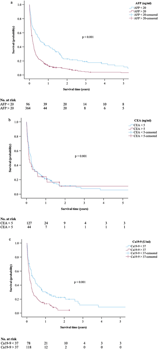 Survival analysis showed that patients with normal levels of AFP and CA19-9 had significantly longer mean survival times (514.29 ± 762.18 and 335.29 ± 588.35 days, respectively; p < 0.001) compared to those with elevated levels (194.55 ± 497.43 and 128.76 ± 170.96 days, respectively; p < 0.001) (Fig. 1). However, there was no significant difference in survival between patients with normal and elevated CEA levels (p = 0.801). The 1-year, 3-year, and 5-year survival rates were 40.63%, 14.58%, and 8.33% for patients with normal AFP levels; 18.90%, 3.15%, and 2.36% for patients with normal CEA levels; and 26.92%, 5.13%, and 3.85% for patients with normal CA19-9 levels, respectively. Conversely, for those with elevated AFP, CEA, and CA19-9 levels, the 1-year, 3-year, and 5-year survival rates were 12.09%, 2.20%, and 1.37%; 18.90%, 2.27%, and 2.27%; and 10.17%, 0.00%, and 0.00%, respectively.