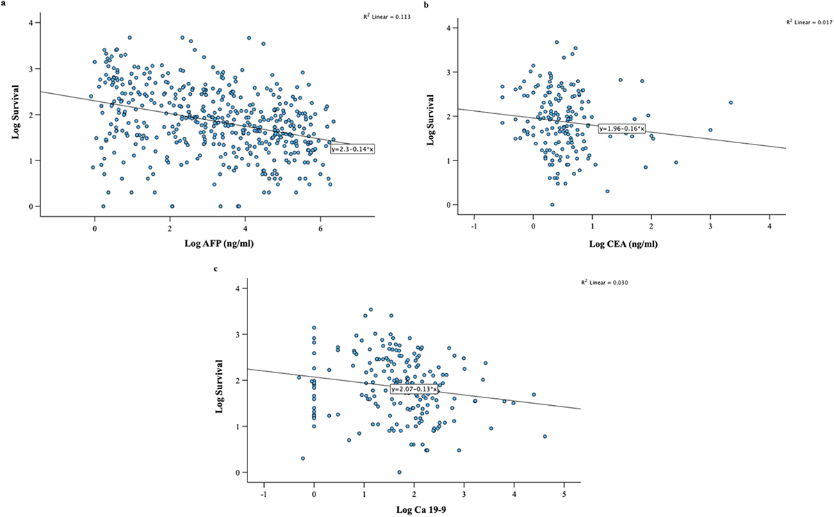 FIGURE 3 -. Scatter plots showing the correlation of tumor marker levels and survival time for (a) AFP, (b) CEA, and (c) CA19-9. Log-transformed tumor marker values are plotted against log-transformed survival duration. Each plot includes a fitted linear regression line with its corresponding equation and R² value.