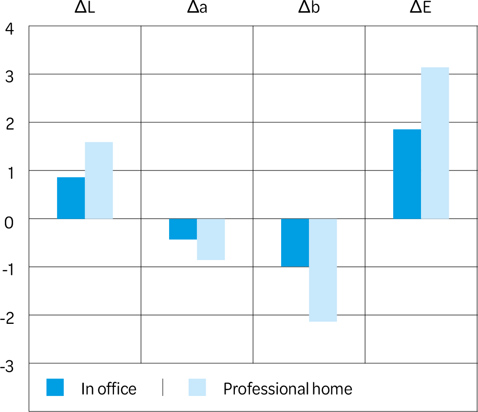 A color variation ΔE is to be considered significantly perceptible from a clinical point of view for values greater than +2.17, as reported by other studies (20). In our sample, although only home whitening shows a ΔE greater than this limit (3,20), even subjects undergoing in-office whitening obtained a clear improvement in tooth color. The difference between the two modalities was statistically significant (p<0.05).