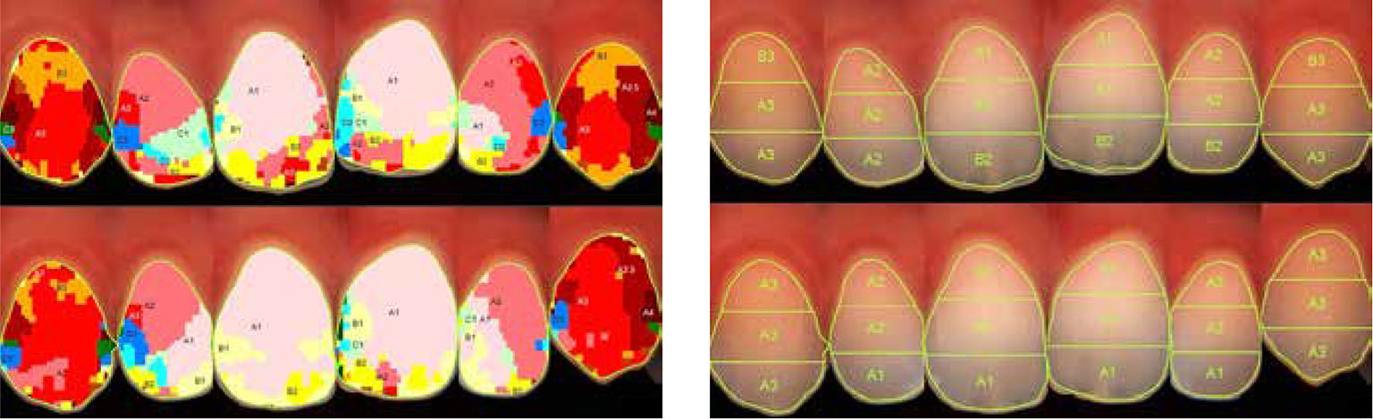 Fig. 2. Example of images of spectrophotometric results after in-office method with 6% hydrogen peroxide. For each image before tooth whitening (above) and after whitening (below).