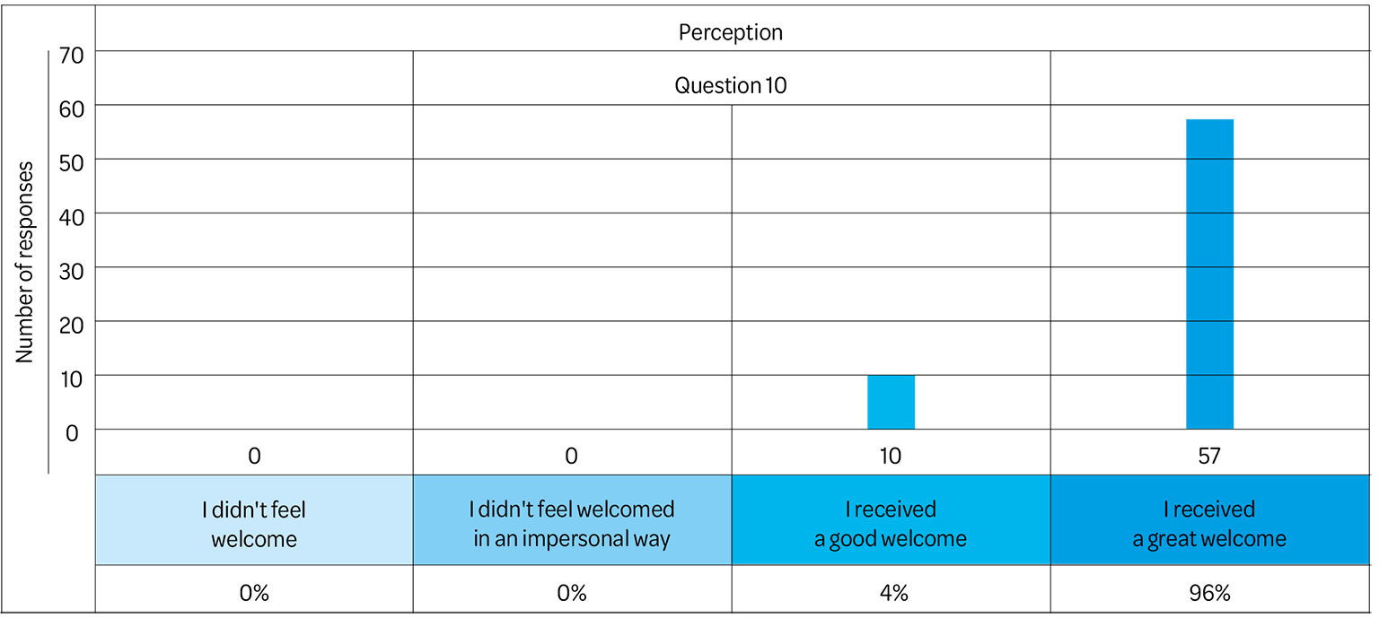 The graph indicates that 85% of respondents perceived an excellent welcome; 15% a good welcome; and none (0%) reported an impersonal welcome or feeling unwelcomed.