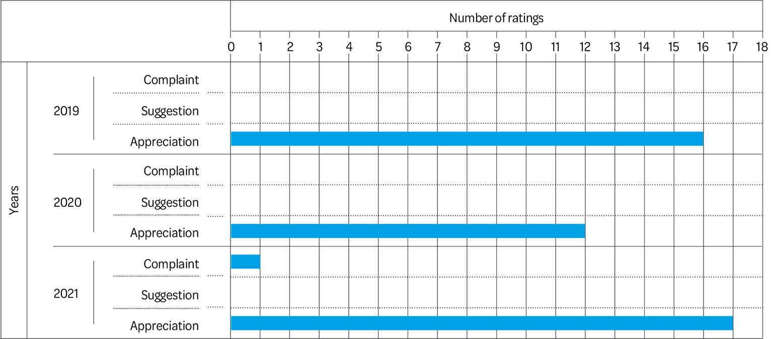 The graph (Figure 22) shows that appreciations predominated across all three years. Specifically, in 2019 there were 16 appreciations, 0 suggestions, and 0 complaints; in 2021, 12 appreciations and 0 suggestions; in 2022, 17 appreciations, 0 suggestions, and 1 complaint.