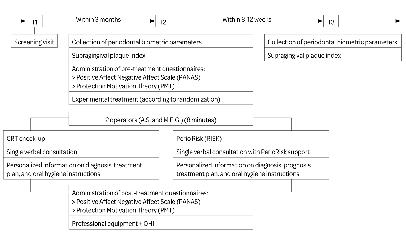 At baseline, after periodontal clinical assessment and questionnaire administration, patients were assigned to RISK or CTR treatment by clinicians administering the interventions only.