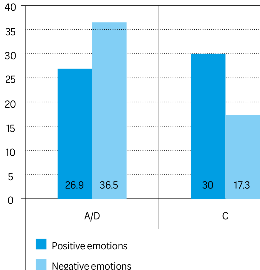 Negative emotion decreased by −4.3 in A/D and −1.5 in C (Figure 5).