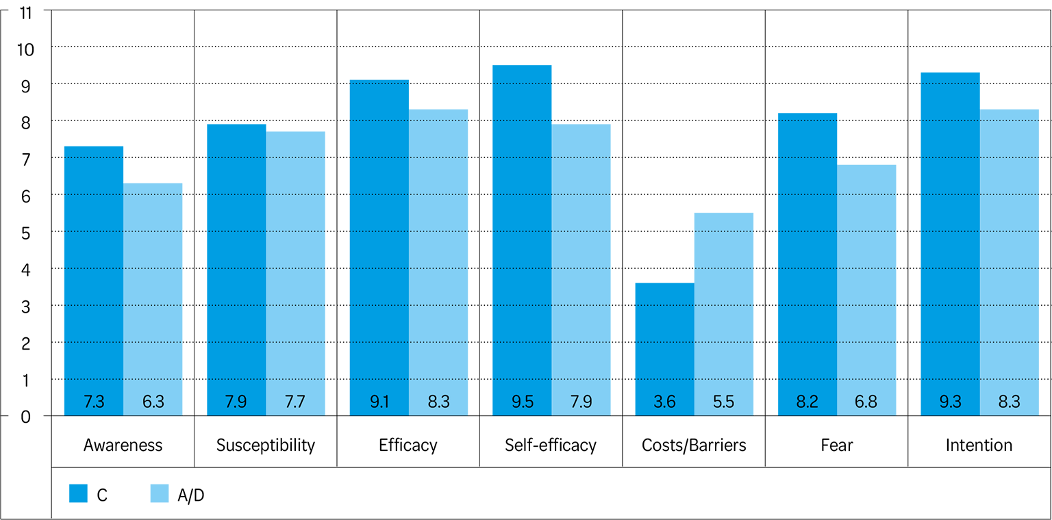At t1, group A/D had lower PMT scores than group C across all domains: awareness (6.3 vs. 7.3), susceptibility (7.7 vs. 7.9), treatment efficacy (8.3 vs. 9.1), self-efficacy (7.9 vs. 9.5), fear/worry (6.8 vs. 8.2), intention to adhere (8.3 vs. 9.3). Group A/D perceived higher treatment costs/barriers (+1.9) than controls (Figure 3).