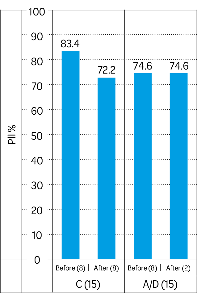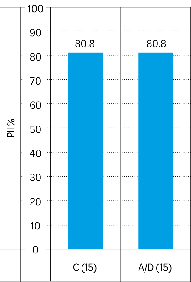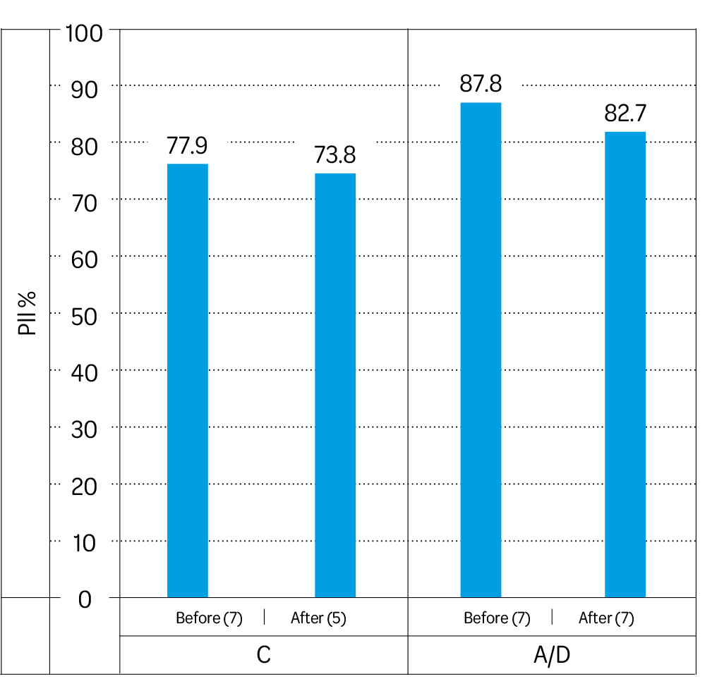 PlI% was comparable (80.8%) between groups at t1 (Figure 4).