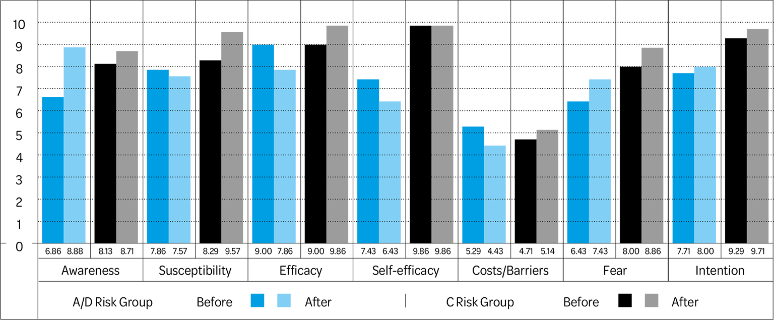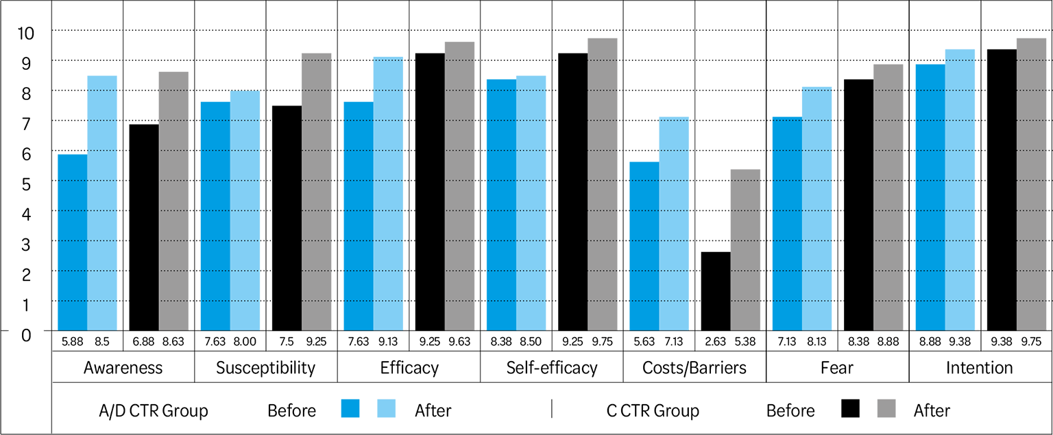 Similarly, CTR increased awareness (+1.75), susceptibility (+1.75), treatment efficacy (+0.38), self-efficacy (+0.5), intention (+0.37), costs/barriers (+2.75), and fear/worry (+0.5) in C (Figure 6).