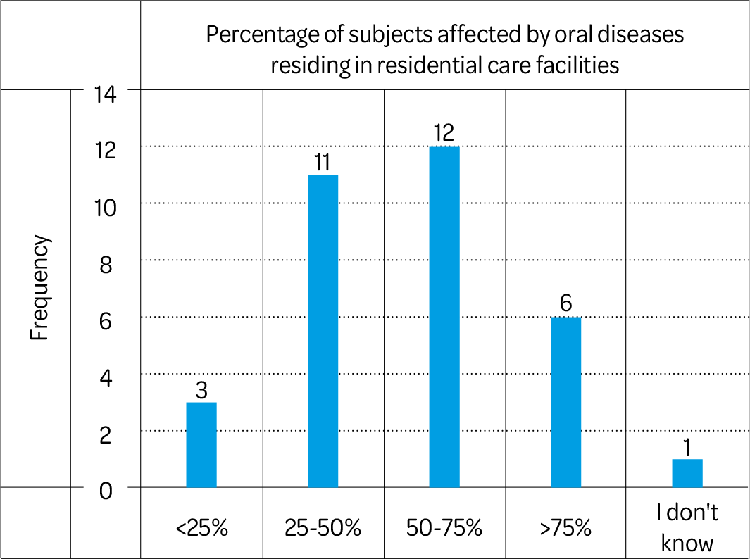However, this study showed that oral health within nursing homes remains a present but largely ignored issue, as evidenced by the low questionnaire response rate (11%). In fact, 37% of surveyed facilities reported that between 50% and 75% of elderly residents in nursing homes have oral problems, most frequently issues with prostheses (21.3%), difficulties in chewing (17.6%), problems with oral hygiene (15.4%), and tooth loss (15.4%).