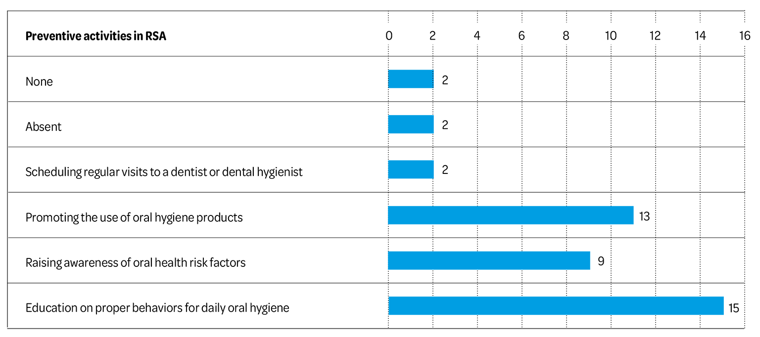 With respect to the adoption of preventive behaviors regarding oral health among nursing homes, this study showed that it is rather poor. In 52% of cases, no preventive practices are promoted. Regarding the execution of periodic assessments to evaluate the oral health status of patients, in 55% of cases this only occurs in specific cases, which suggests a therapeutic rather than preventive approach to oral health. Supporting this, the data showed that dental check-ups are rarely scheduled in 54.5% of cases, oral health data are recorded only in specific instances in 55% of cases, and 67% of facilities do not provide patients with any oral education.
