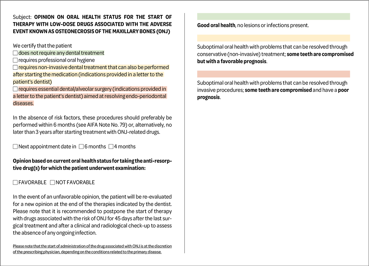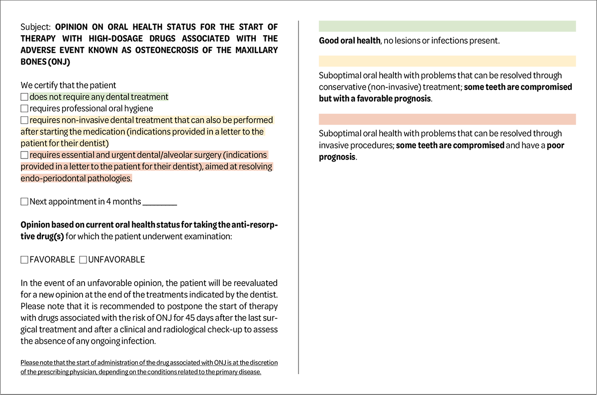 For better understanding, knowledge of the categories of patients at risk for MRONJ, risk factors (e.g., drug-related, systemic, and local), clinical and radiological diagnostic criteria, and disease staging is indispensable. Information regarding these topics is described in the 2020 Clinical-Therapeutic Recommendations for Medication-Related Osteonecrosis of the Jaw (ONJ) and its Prevention, freely available online (https://www.sipmo.it/versione-2-0-delle-raccomandazioni-clinico-terapeutiche-sullosteonecrosi-delle-ossa-mascellari-onj-farmaco-relata-e-sua-prevenzione/) (23).