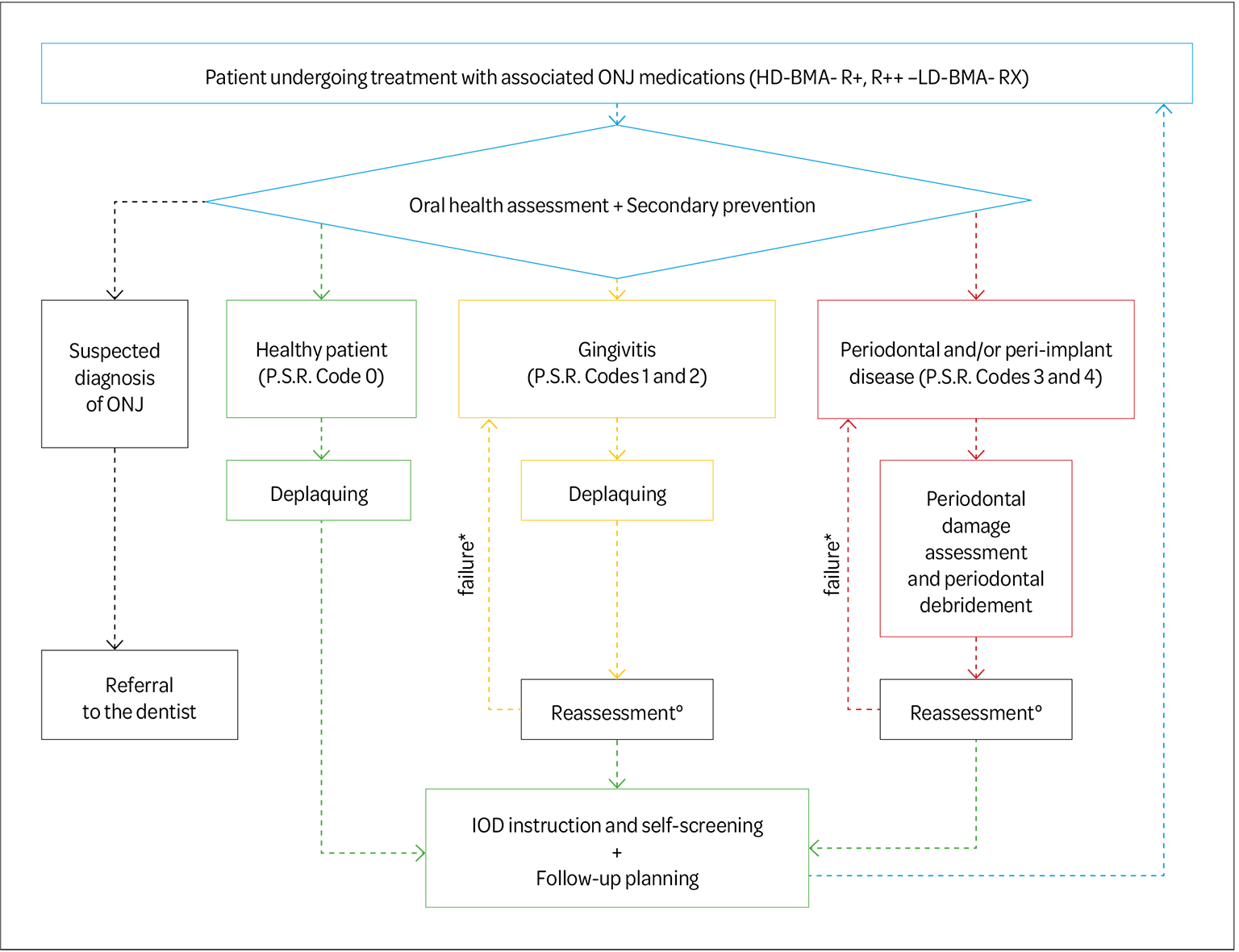 Fig. 2. Flow chart of the primary prevention pathway pre-therapy with associated ONJ drugs: patients candidates for therapy with LD-BMA and HD-BMA (modified from Mauceri et al) (21). IOD: home oral hygiene. ° Re-evaluation: no more than 30 days later. * If periodontal debridement does not lead to resolution, evaluate alternative primary prevention strategies.