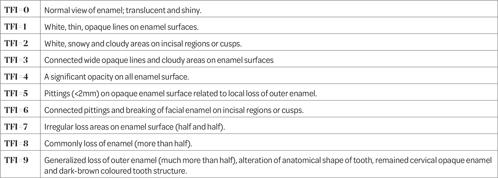 The first diagnoses of fluorosis were made in North America by Dr. Dean in 1942, who described an initial broad classification ranging from questionable, mild, moderate to severe. Subsequently, new classifications emerged: in 1984, The Tooth Surface Index of Fluorosis (TSIF), from grade 0 to grade 7, up to the most detailed and currently used classification of 2010 by Thylstrup & Fejerskov (TF Index), from grade 0 to grade 9 (Fig. 1) (3, 4). Currently, in some countries, water fluoridation is permitted to reduce the incidence of caries in the population, but concentrations greater than 1.5 mg/l tend to create a risk of dental fluorosis, and at higher concentrations tend to extend to skeletal tissue.