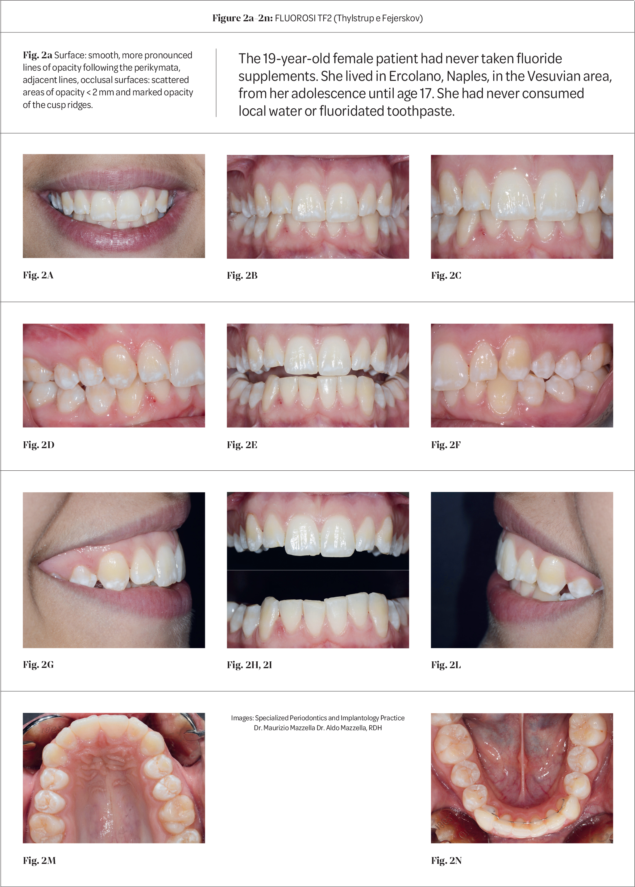 Following careful diagnosis and medical history, patient B., who resided in Herculaneum (Vesuvian area), presents fluorosis stains classified according to the Thylstrup & Fejerskov classification as TF2 (smooth, opaque lines present; intact enamel but pronounced at the perikymata; occasionally confluent adjacent lines; on occlusal surfaces, scattered areas of opacity <2 mm and marked opacity on cusp ridges). The female patient, aged 19, had never taken fluoride-based supplements. She lived in Herculaneum, Naples (Vesuvian area) until the age of 17. She had never consumed local water, nor ingested fluoride toothpastes or supplements during childhood. She expressed a strong desire to correct a significant aesthetic concern given her age, having explored various solutions — including the use of highly abrasive whitening toothpastes — before consulting us (Fig. 2). The procedure carried out in these case reports, in addition to an evaluation of the smile line (whose exposure was >3 mm of teeth and gingiva, thus classified as a Gummy Smile (5)), was the only safe and minimally invasive procedure available and was developed in several phases.